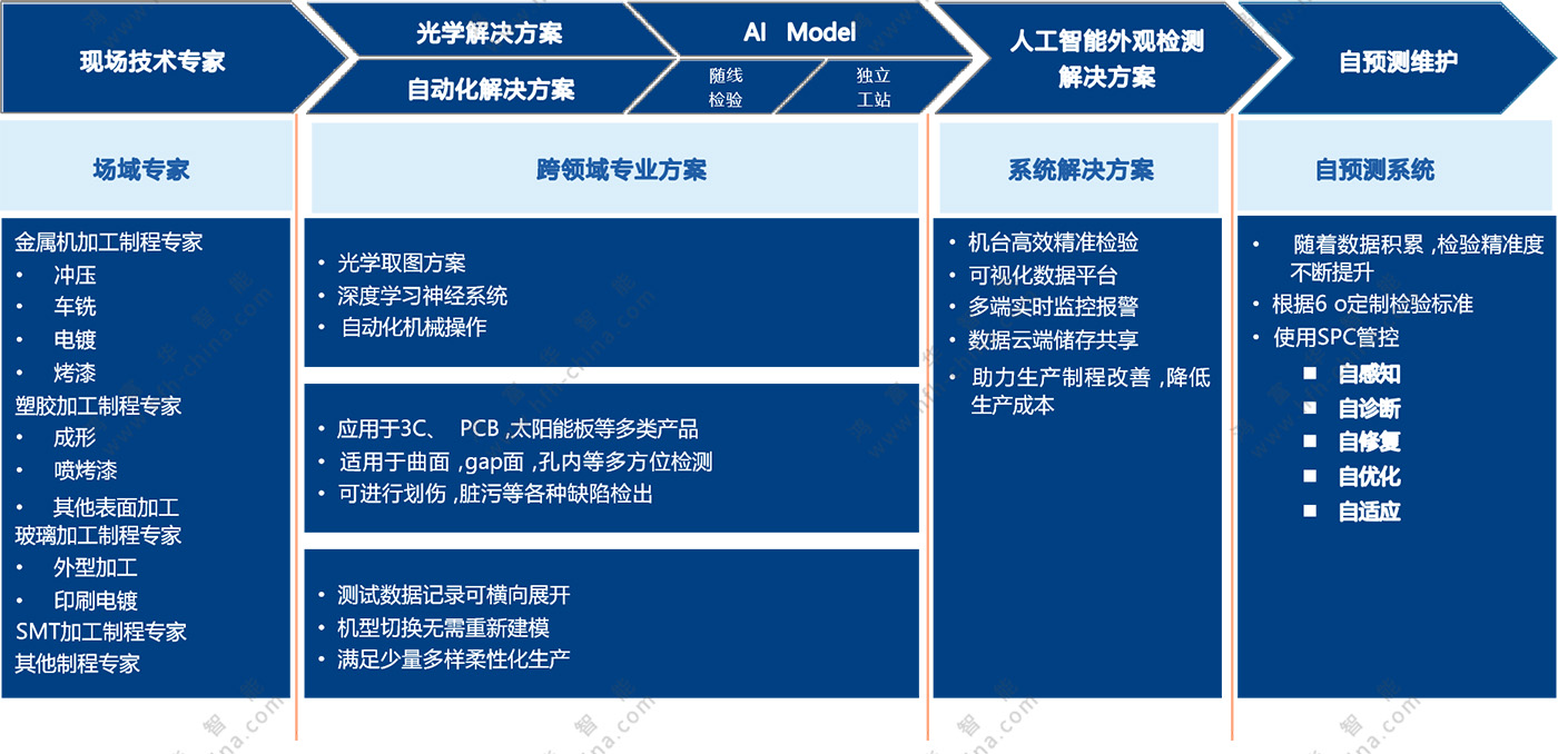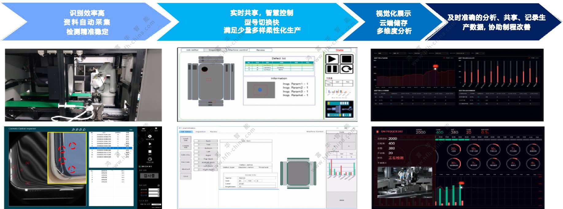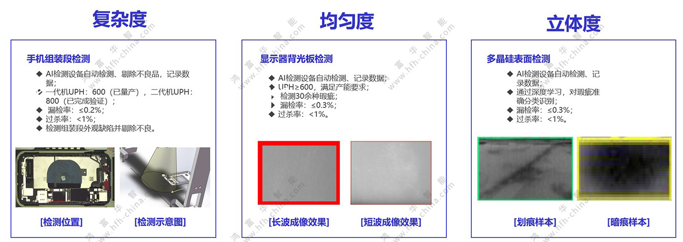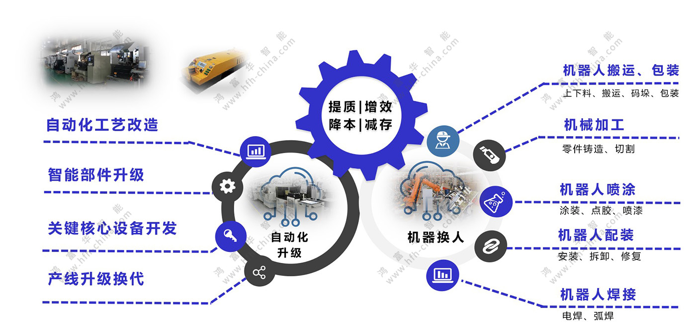 鴻富華提供自動化生產線設計、機器換人與設備智能化升級改造、AI視覺檢測服務。幫助企業合理的規劃生產線,實現生產高效、產線穩定、人機搭配合理、避免投資風險、操作維護標準化的目的。同時,通過自動化(含AI視覺檢測設備)導入,取代或輔助操作高頻重復及簡單、低效率、高人力成本、高體力勞動、高風險發生、高品質異常、高精度要求、人力檢測所難以觸及的生產與檢測環節,以提升生產效率、生產安全性、產品品質,緩解工人勞動強度,降低整體成本。其中,通過設備的智能化升級改造,實現“人、機、料、法、環、測”的信息化覆蓋和數據聯通,推動經營管理各環節的更好融合,解決工廠設備信息孤島、管理職能壁壘等問題。