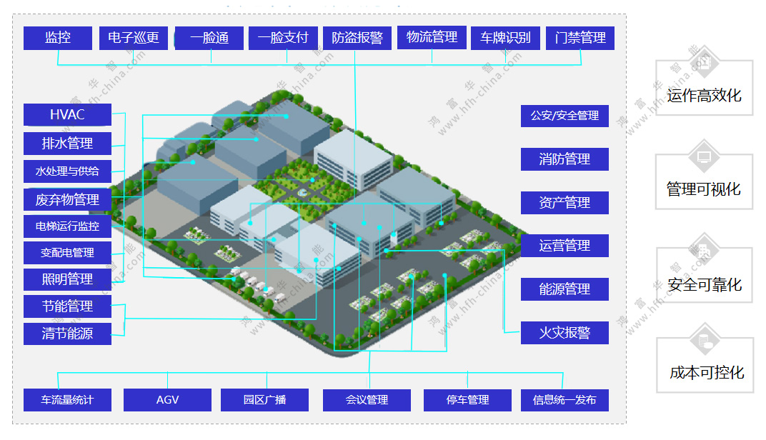 某世界500強企業集團下屬生產基地,為加強園區的運營管控,包括人流與考勤管理、安防與消防管理、員工宿舍區管理、工廠環保等,決定對園區進行智慧化管控。